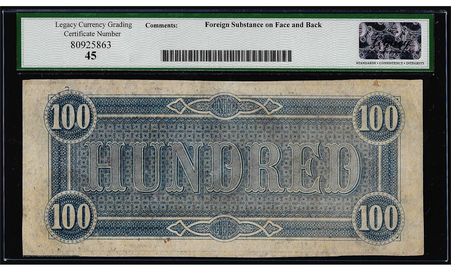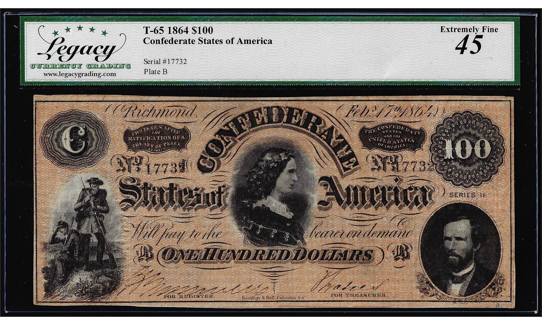1864 $100 Confederate States of America Note T-65 Legacy Extremely Fine 45