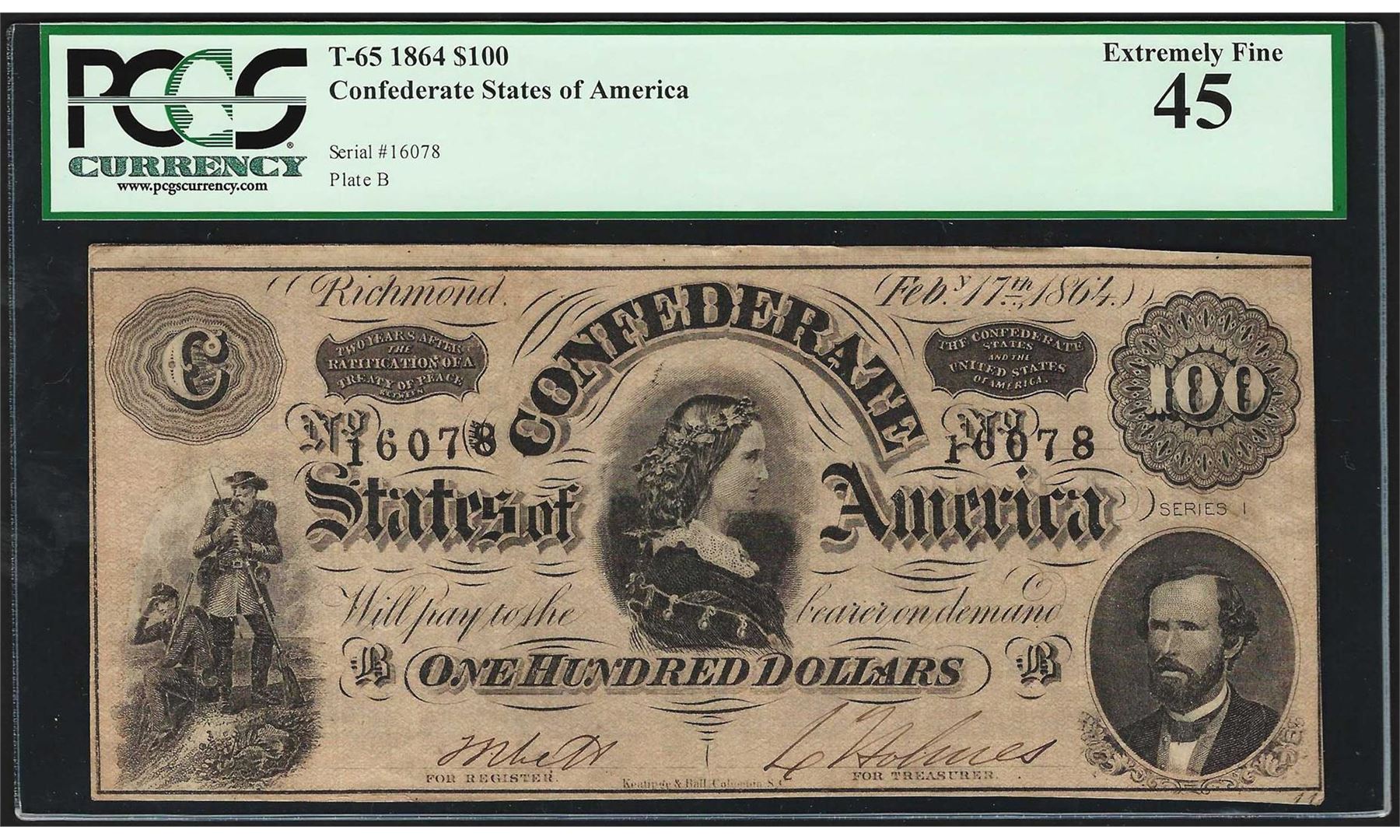 One 1864 $100 Confederate States of America Note T-65 PCGS Extremely Fine 45. PCGS Graded.