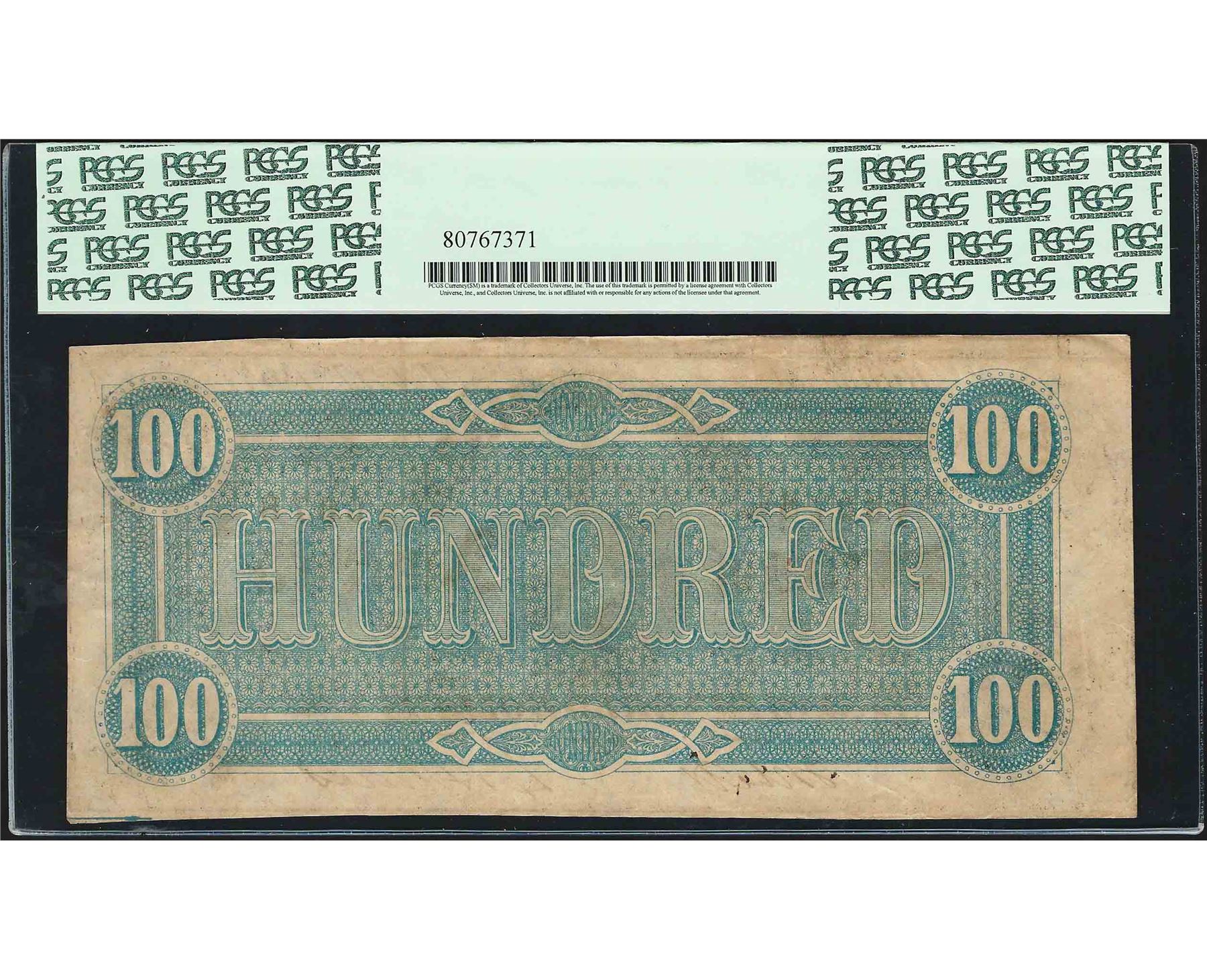 1864 $100 Confederate States of America Note T-65 PCGS Extremely Fine 45
