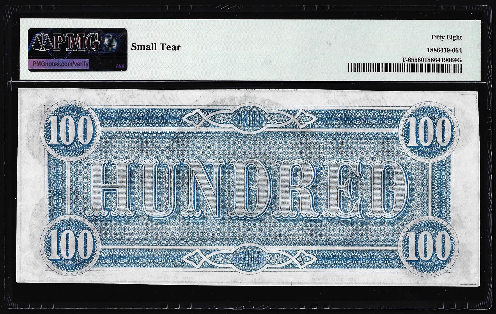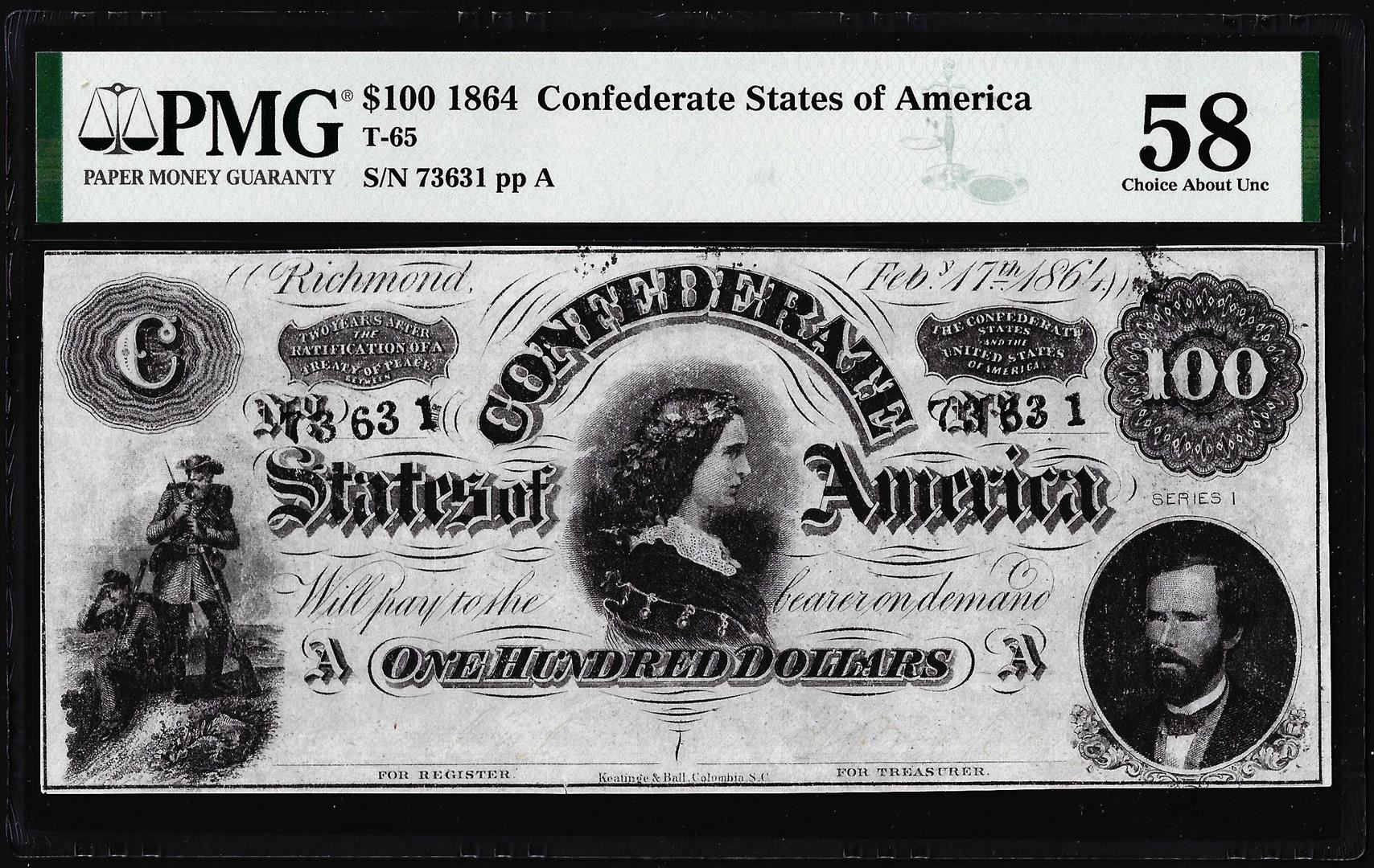 1864 $100 Confederate States of America Note T-65 PMG Choice About Uncirculated 58