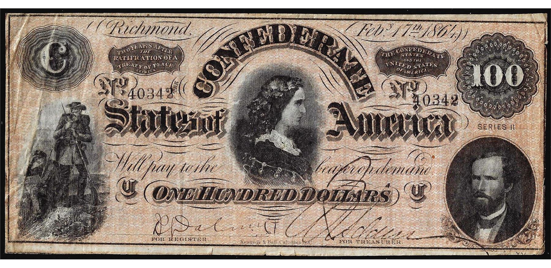 One 1864 $100 Confederate States of America Note.