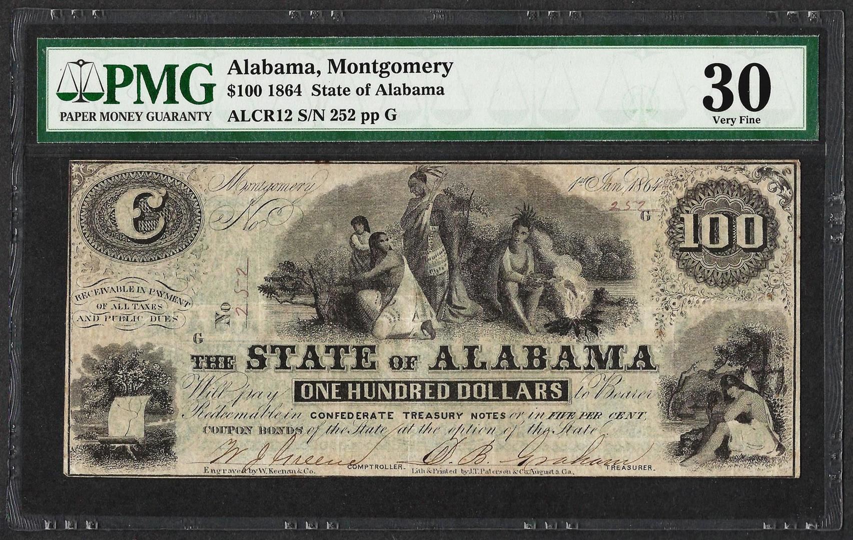 One 1864 $100 State of Alabama Obsolete Note PMG Very Fine 30. PMG Certified.