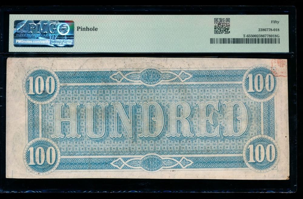One 1864 $100 T-65 Confederate PMG 50.