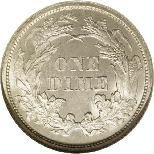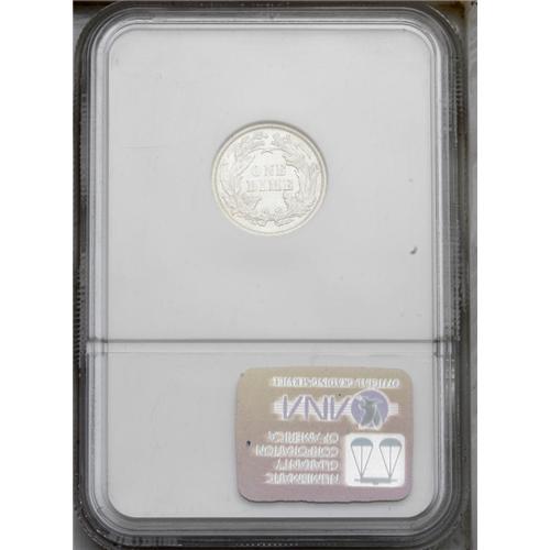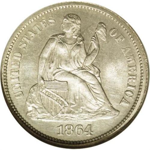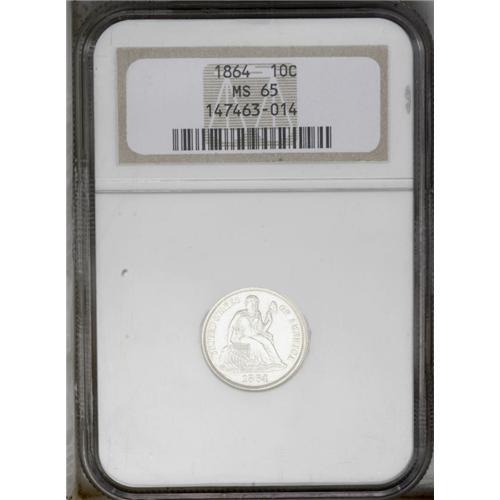 <B>1864<10C> MS65 NGC.</B></I> The removal of silver coins from active circulation during the Civil War explains the limited original mintage of this P-mint issue. This is a rare date, and the present Gem is one of only nine MS65 examples known to NGC, with four finer (3/06). Untoned in the centers, the frosty surfaces are faintly ringed in champagne peripheral accents. Both sides are crisply impressed, bold clashmarks are noted in the fields on each side.