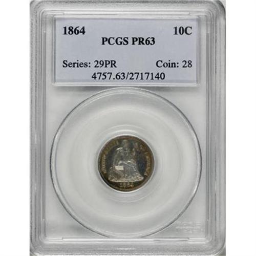 <B>1864 10C PR63 PCGS.</B></I> Luminous gold-orange patina drapes the margins of this Select dime, while the centers are minimally toned. Boldly impressed with scattered hairlines and contact in the strongly reflective fields. Still, a pleasing survivor from this issue of only 470 pieces.<BR><BR><B>Coin Engraver:</B> Christian Gobrecht<BR><BR><b>Shipping:</b> Coins & Currency (<a target="_blank" href="http://www.heritageauctions.com/common/shipping.php">view shipping information</a>)