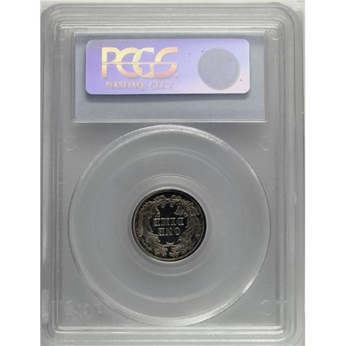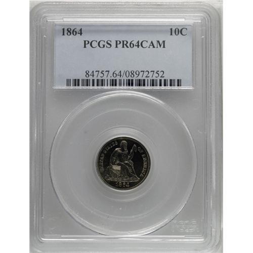 <B>1864<10C> PR64 Cameo PCGS.</B></I> Lovely deep burgundy-brown coloration inhabits the obverse fields. The greenish-gray reverse toning is somewhat lighter. Sharply struck and carefully preserved, with good reflectivity and a small number of pinpoint-sized marks that preclude a higher numerical grade assessment. Mild cameo contrast on each side ensures a pleasing appearance. Population: 5 in 64 Cameo, 8 finer (6/06).