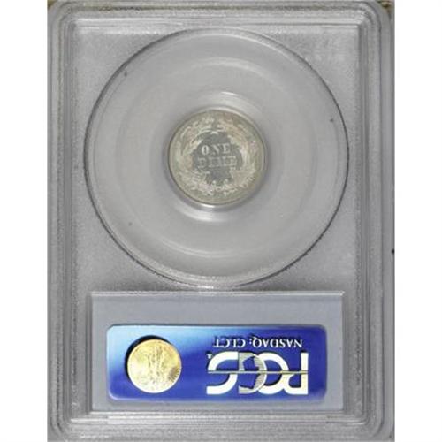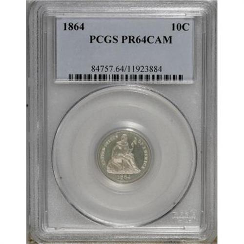 <B>1864 10C PR64 Cameo PCGS.</B></I> Though light silver-gray haze has settled over the gleaming fields, the mirrors retain significant contrast with the richly frosted, boldly impressed devices. A few faint hairlines and isolated points of contact preclude Gem status. Population: 6 in 64 Cameo, 12 finer (1/08).<BR><BR><b>Shipping:</b> Coins & Currency (<a target="_blank" href="http://www.heritageauctions.com/common/shipping.php">view shipping information</a>)