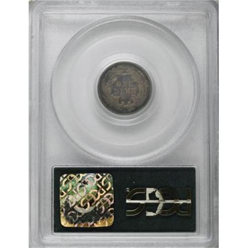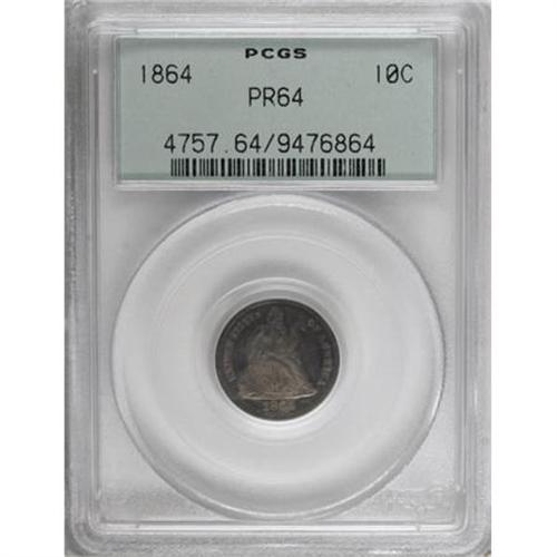 <B>1864 10C PR64 PCGS.</B></I> A richly patinated Choice survivor from this wartime proof issue of only 470 dimes. Dusky violet, gold, and rose shades grace the luminous surfaces of this crisply struck, faintly hairlined specimen. Population: 39 in 64, 21 finer (8/07).<B><BR></B></I><I>From The Beau Clerc Collection.</B></I><BR><BR><B>Coin Engraver:</B> Christian Gobrecht<BR><BR><b>Shipping:</b> Coins & Currency (<a target="_blank" href="http://www.heritageauctions.com/common/shipping.php">view shipping information</a>)