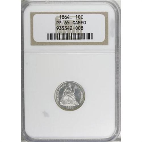 <B>1864 10C PR65 Cameo NGC.</B></I> Brilliant and well struck with pleasing contrast between the frosty devices and deep mirrored fields. Only 470 proofs were struck, and the business strikes from this date are also very elusive. Census: 7 in 65 Cameo, 10 finer (8/07).<BR><BR><b>Shipping:</b> Coins & Currency (<a target="_blank" href="http://www.heritageauctions.com/common/shipping.php">view shipping information</a>)