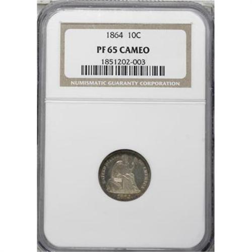 <B>1864 10C PR65 Cameo NGC.</B></I> Mirrorlike fields accentuate the motifs on this attractive Civil War-era dime. Lightly toned surfaces exhibit well struck devices, and both sides are quite well preserved. Census: 7 in 65 Cameo, 7 finer (1/08).<BR><BR><b>Shipping:</b> Coins & Currency (<a target="_blank" href="http://www.heritageauctions.com/common/shipping.php">view shipping information</a>)