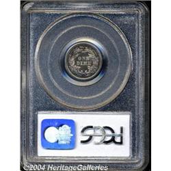 <B>1864<10C> PR65 Cameo PCGS.</B></I> The cameo effect is greatly enhanced by the moderately toned blue and purple fields setting off the silver-gray devices. Significant abrasions appear to be absent, and the toning hides any light marks that may be present. A beautiful Civil War issue proof dime.<BR><I>Ex: Kreisberg, Schulman, Cohen Sale (4/67), lot 1453, where it sold for $105.</B></I> <BR><BR><B>Important notice:</B> Heritage usually auctions material at the rate of 200-250 lots per hour. On some occasions eBay Live bid software or the Internet may not be able to keep up with the pace of the auction. We recommend placing a realistic absentee bid now as insurance to avoid disappointment. Occasionally the auctioneer may eliminate or reject an eBay Live bid, and the auctioneer may also reopen a lot after the close of the eBay live bidding (usually because we missed an audience bid), and may reject your bid even if it shows you as the winning bidder. By bidding via eBay Live, you agree that Heritage may award the lot to another bidder at its sole discretion under the circumstances described above or any other reasonable circumstances. Since eBay bids are not shown to us until we open the lot on the floor, we treat those bids just like floor bids. In most cases the floor responds before the eBay bid is presented to us, due to Internet lag time, so for consistency we have made it a policy that floor bids are always considered first over tie eBay live bids. Also please note that all Heritage lots purchased through eBay Live carry a 20% Buyer's Premium. Please make sure you read the Terms and Conditions before you bid.