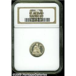 <B>1864 10C PR66 Cameo NGC.</B></I> A sparkling white coin that is very well preserved and quite rare in this grade. The surfaces are a delight to study, with just a whisper of contact found on the delicate mirror fields. Great contrast between the devices and fields, as expected. Fully struck throughout and a very pleasing coin indeed. Population: 2 in 66, 3 finer (2/05).