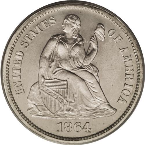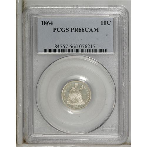 <B>1864 10C PR66 Cameo PCGS.</B></I> The continued production of small quantities of proof coins in the 1860s seems absurd at times, particularly when juxtaposed with the brutal endgame of the Civil War. Yet the mintages continued, and Philadelphia struck 470 proof dimes in 1864. That issue yielded a number of spectacular survivors, including the present piece. The richly frosted devices display bold detail as always, and the mirrors remain deep, with only a trace of silver-gray patina. An amazing specimen. Population: 4 in 66 Cameo, 2 finer (2/07).<BR><BR><b>Shipping:</b> Coins & Currency (<a target="_blank" href="http://www.heritageauctions.com/common/shipping.php">view shipping information</a>)