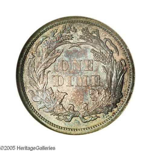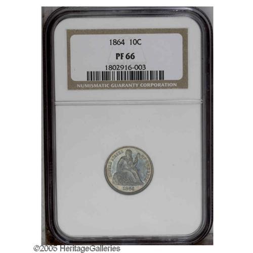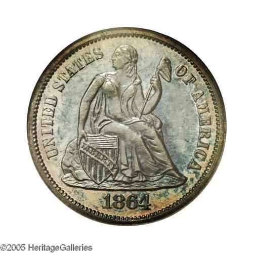<B>1864<10C> PR66 NGC.</B></I> Toned over the entire surface with mottled deep blue and russet. The mirror fields are clean but do show a faint line or two in the left obverse. One of the finer graded examples to emerge from the 470 struck during the waning days of the Civil War. Census: 12 in 66, 5 finer (12/05).