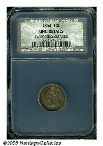1864 10C Unc Details, Improperly Cleaned, NCS. Th