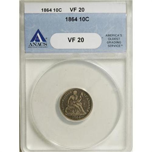 <B>1864 10C VF20 ANACS.</B></I> . NGC Census: (1/34). PCGS Population (2/38). Mintage: 11,000. Numismedia Wsl. Price for NGC/PCGS coin in VF20: $417. (#4639)<BR><BR><B>Coin Engraver:</B> Christian Gobrecht<BR><BR><b>Shipping:</b> Coins & Currency (<a target="_blank" href="http://www.heritageauctions.com/common/shipping.php">view shipping information</a>)