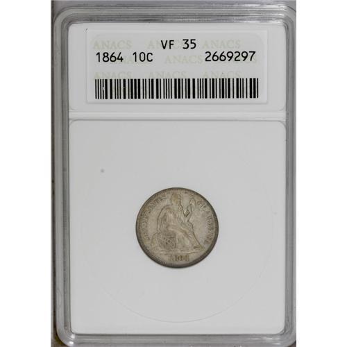1864 10C VF35 ANACS. This low mintage Civil War issue 1864[10C] VF35 ANACS.
