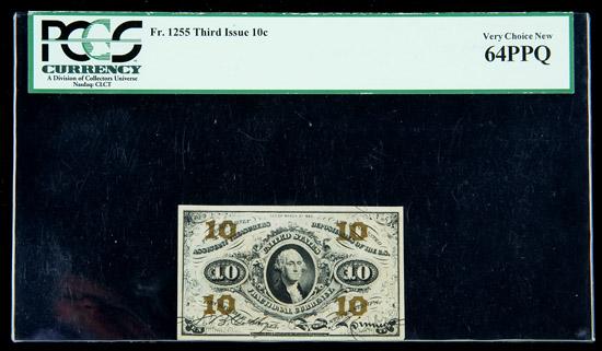 1864, 10¢ Fractional Currency. Third Issue, green reverse. PCGS Very Choice New 64PPQ. . Fr-1255. A lovely near-Gem example with broad margins and excellent face centering. Fully original and with embossing that can be seen through the holder.