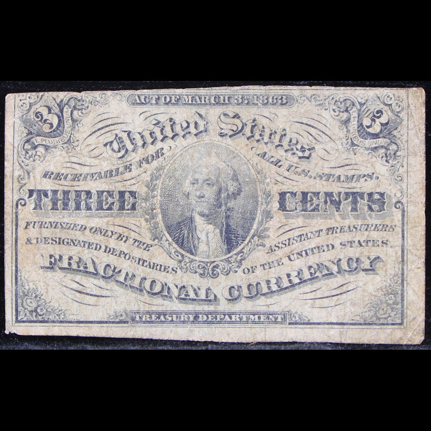 1864-1869 3c 3rd series Fractional currency, F1226 Light background behind Washington Grades f+