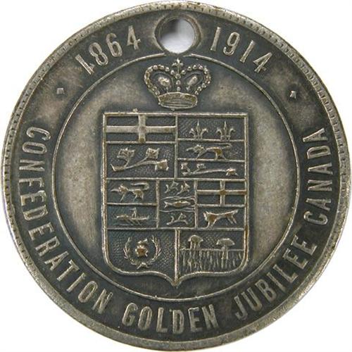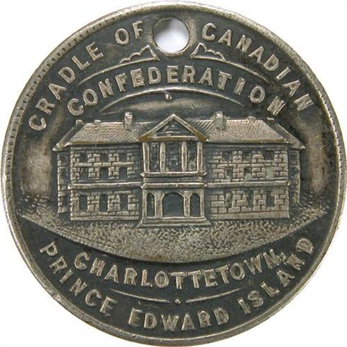 1864-1914 Confederation Golden Jubilee Canada / Cradle of Confederation, Charlottetown, Silver plated 32mm, VF-EF with suspension hole at 12 oclock