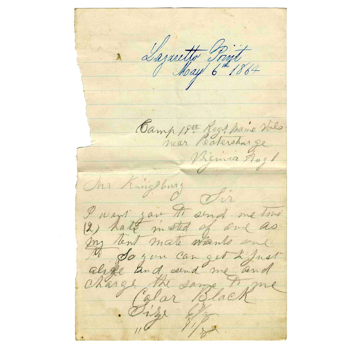ALS from D.E. Cunningham of the 19th Maine Infantry, Company C. Brief pencil missive datelined ''Camp 19th Regt. Maine Vols. near Peatersburge / Virginia Aug 1 [1864],'' reads in full: ''…Mr. Kingsburg, Sir I want you to send me two (2) hats insted of one as my tent mate wants one to. So you can get 2 just alike and send me and charge the same to me. Color Black Size 6 7/8 Size 7 1/8 Get as light ones as you can and oblige me. D.E. Cunningham P.S. Please send them as soon as convenient.'' Cunningham mustered into Company C on 2 September 1863. During his service, the 19th Maine was engaged at Bristoe Station, Gettysburg, Mine Run, Spotsylvania Courthouse, Totopotomoy Creek, Cold Harbor and Petersburg. On 15 December 1864 Cunningham transferred to the 1st Maine Heavy Artillery, which saw action at Hatcher's Run and Bailey's Crossroads and later participated in the grand review at Washington. The 1st Maine mustered out on 11 September 1865. Letter measures 4.5'' x 7'' and runs 1.25pp. Minimal soiling, otherwise near fine condition.