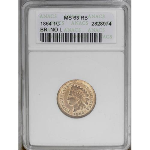 <B>1864<1C> Bronze No L MS63 Red and Brown ANACS.</B></I> Softly struck on the upper headdress feathers, but well detailed otherwise, with lovely golden-tan and mottled reddish patina, and full gleaming luster. Struck from mildly rotated dies, with carefully preserved surfaces that are blemish-free.