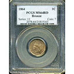 <B>1864 1C Bronze No L MS64 Red PCGS.</B></I> Sharply struck and highly lustrous, with numerous flyspecks on obverse and reverse alike. Just one minor contact mark is evident, on Liberty's jaw, and there are one or two faint die clash marks (as struck) on each side of the coin. Lot:5203