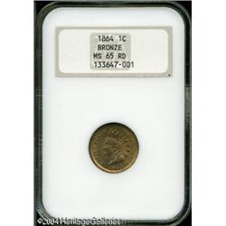 1864 1C Bronze No L MS65 Red NGC. First year of th <B>1864 1C Bronze No L MS65 Red NGC.</B></I> First year of the new bronze composition and an important coin as such. Of additional rarity and importance as early Indian cents are very elusive in the better grades of Uncirculated, especially with the original mint luster still fully intact. This is an attractive, lustrous piece that shows a few small, scattered flyspecks of carbon on each side. <BR><BR><B>Important notice:</B> Heritage usually auctions material at the rate of 200-250 lots per hour. On some occasions eBay Live bid software or the Internet may not be able to keep up with the pace of the auction. We recommend placing a realistic absentee bid now as insurance to avoid disappointment. Occasionally the auctioneer may eliminate or reject an eBay Live bid, and the auctioneer may also reopen a lot after the close of the eBay live bidding (usually because we missed an audience bid), and may reject your bid even if it shows you as the winning bidder. By bidding via eBay Live, you agree that Heritage may award the lot to another bidder at its sole discretion under the circumstances described above or any other reasonable circumstances. Since eBay bids are not shown to us until we open the lot on the floor, we treat those bids just like floor bids. In most cases the floor responds before the eBay bid is presented to us, due to Internet lag time, so for consistency we have made it a policy that floor bids are always considered first over tie eBay live bids. Also please note that all Heritage lots purchased through eBay Live carry a 20% Buyer's Premium. Please make sure you read the Terms and Conditions before you bid. This lot is being auctioned in conjunction with a live floor auction by Heritage Galleries & Auctioneers. All final auction and invoice information will be supplied by Heritage Galleries & Auctioneers, and all other information should be considered preliminary. Lot:5077