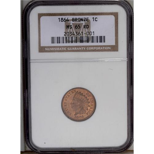 <B>1864<1C> Bronze No L MS65 Red NGC.</B></I> The fresh orange-copper surfaces thrive on this lustrous Gem. Nicely defined with a couple tiny carbon spots on either side.