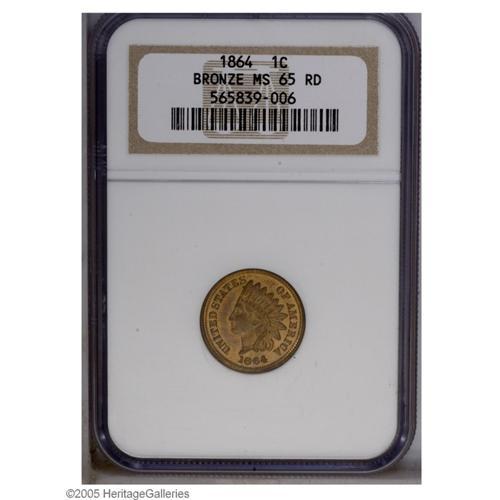 1864 1C Bronze No L MS65 Red NGC. Yellow-gold color ha 1864[1C] Bronze No L MS65 Red NGC.