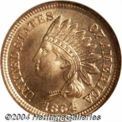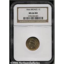 <B>1864<1C> Bronze No L MS66 Red NGC.</B></I> This is a lustrous, golden-red Gem whose surfaces are sharply impressed in all areas, save for several of the feather tips. There is not a single grade-limiting abrasion, and only the slightest amount of carbon can be detected on the reverse under close examination. Population: 23 in 66, 2 finer (6/04). <BR><BR><B>Important notice:</B> Heritage usually auctions material at the rate of 200-250 lots per hour. On some occasions eBay Live bid software or the Internet may not be able to keep up with the pace of the auction. We recommend placing a realistic absentee bid now as insurance to avoid disappointment. Occasionally the auctioneer may eliminate or reject an eBay Live bid, and the auctioneer may also reopen a lot after the close of the eBay live bidding (usually because we missed an audience bid), and may reject your bid even if it shows you as the winning bidder. By bidding via eBay Live, you agree that Heritage may award the lot to another bidder at its sole discretion under the circumstances described above or any other reasonable circumstances. Since eBay bids are not shown to us until we open the lot on the floor, we treat those bids just like floor bids. In most cases the floor responds before the eBay bid is presented to us, due to Internet lag time, so for consistency we have made it a policy that floor bids are always considered first over tie eBay live bids. Also please note that all Heritage lots purchased through eBay Live carry a 20% Buyer's Premium. Please make sure you read the Terms and Conditions before you bid. </span></font></tr></table></td></tr></table>