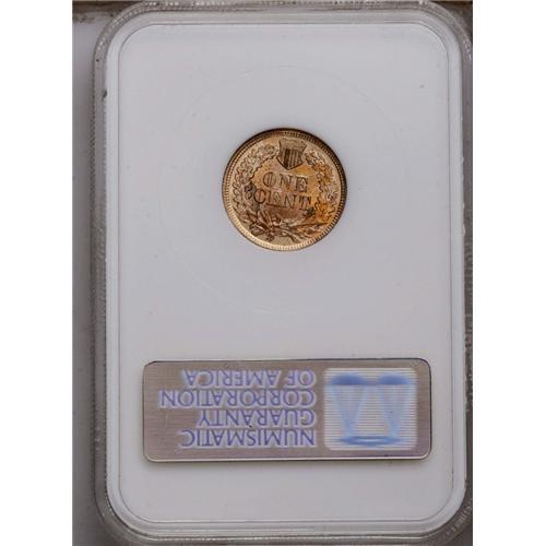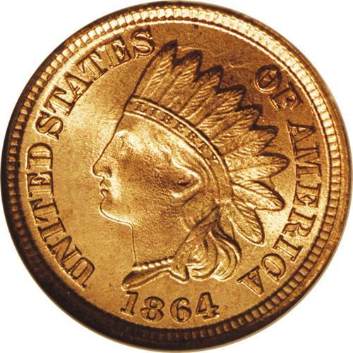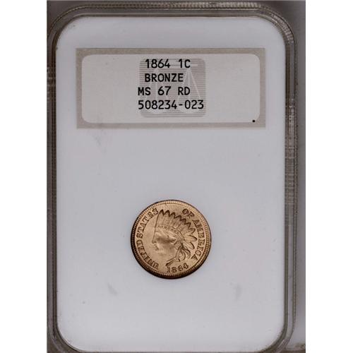 <B>1864<1C> Bronze No L MS67 Red NGC.</B></I> Snow speculates that there may be a large number of fully struck 1864 Bronze Cents because the Mint used the same striking pressure on the new bronze alloy as they did to strike the copper-nickel coins. Sharp striking definition is seen on the feather tips and on the four diamonds, as well as on the shield lines. The texture of the surfaces displays the granularity often seen on this issue as well as reddish-golden color. Even close examination fails to reveal an abrasion worthy of singular mention. For pedigree purposes, a small circular area of slightly deeper color is noted at the right base of the T of CENT. Population at both services combined: 3 in 67, none are finer (4/06).