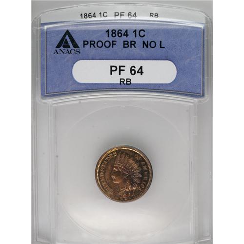 <B>1864 1C Bronze No L PR64 Red and Brown ANACS.</B></I> The striking details are razor-sharp and the fields retain nice reflectivity, despite a coating of dappled patina across each side. Free of bothersome hairlines or handling marks.<BR><BR><b>Shipping:</b> Coins & Currency (<a target="_blank" href="http://www.heritageauctions.com/common/shipping.php">view shipping information</a>)