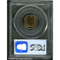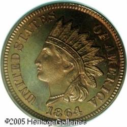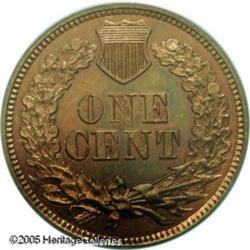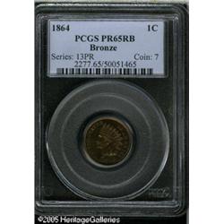 <B>1864 1C  Bronze No L PR65 Red and Brown PCGS.</B></I> The actual mintage of this issue is unknown, but a reasonable estimate is around 300 pieces, considering the number of pieces extant today in all grades and colors and the number that must have been lost over the years from attrition. The fields on this piece are deeply mirrored on each side and each side shows a pleasing mix of deep cherry-red, turquoise-blue, and golden-tan colorations. A lovely example of this solidly graded Gem proof.    Lot:5278