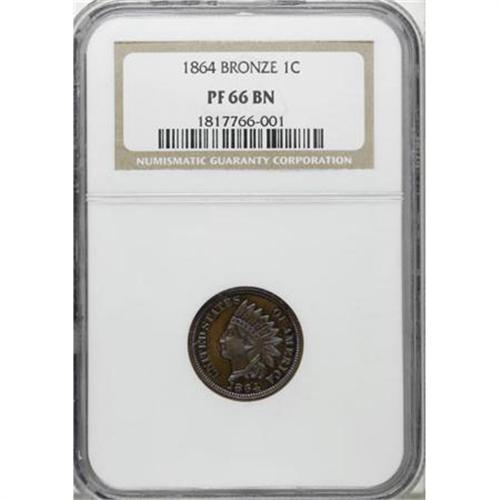 <B>1864 1C Bronze No L PR66 Brown NGC.</B></I> A wonderfully colored and well struck example. The reflective surfaces show fabulous sapphire and ruby tones and when viewed at certain angles, there is a suggestion of cameo contrast.<BR><BR><B>Coin Engraver:</B> James B. Longacre<BR><BR><b>Shipping:</b> Coins & Currency (<a target="_blank" href="http://www.heritageauctions.com/common/shipping.php">view shipping information</a>)
