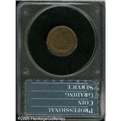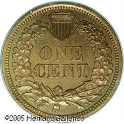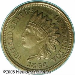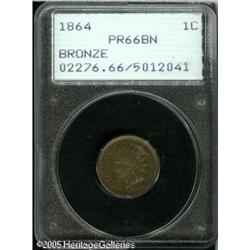 <B>1864 1C  Bronze No L PR66 Brown PCGS.</B></I> Moderately reflective, the basic brown surfaces have an overlay of olive and deep red iridescent toning. Only 150 proofs were struck. Housed in an early PCGS holder. Population: 3 in 66, 0 finer (1/05).    Lot:5277