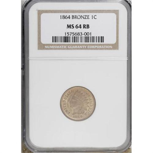 <B>1864 1C Bronze No L MS64 Red and Brown NGC.</B></I> NGC Census: (141/291). PCGS Population (299/189). Mintage: 39,233,712. Numismedia Wsl. Price for NGC/PCGS coin in MS64: $180. (#2077)<BR><BR><B>Coin Engraver:</B> James B. Longacre<BR><BR><b>Shipping:</b> Coins & Currency (<a target="_blank" href="http://www.heritageauctions.com/common/shipping.php">view shipping information</a>)