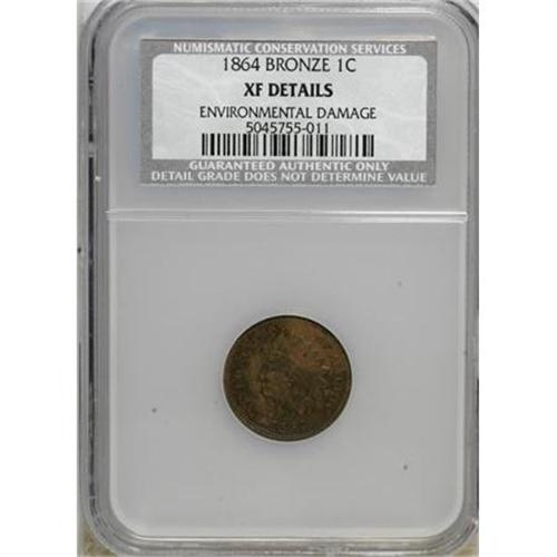 <B>1864 1C Bronze No L--Environmental Damage--NCS. XF Details.</B></I> NGC Census: (4/335). PCGS Population (6/228). Mintage: 39,233,712. Numismedia Wsl. Price for NGC/PCGS coin in XF40: $49. (#2076)<BR><BR><B>Coin Engraver:</B> James B. Longacre<BR><BR><b>Shipping:</b> Coins & Currency (<a target="_blank" href="http://www.heritageauctions.com/common/shipping.php">view shipping information</a>)