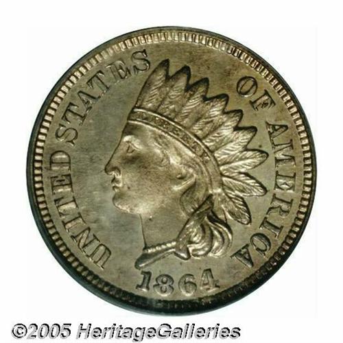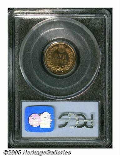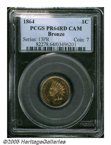 <B>1864<1C> Bronze PR64 Red Cameo PCGS.</B></I> An eye-catching and boldly contrasted example of the inaugural bronze composition Indian Cent, and decidedly scarce as such. Blazing, light golden-bronze with heavily frosted devices that exhibit a few minor grade-limiting contact marks, and flashy, pristine mirrors that reflect hints of smoky steel-blue and cherry hues. Population: 6 in 64 Cameo, 5 finer (3/05).