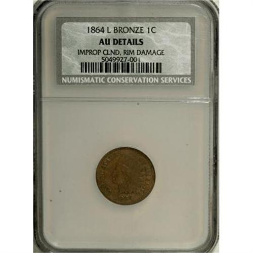 <B>1864 1C L On Ribbon--Improperly Cleaned, Rim Damaged--NCS. AU Details.</B></I> NGC Census: (16/328). PCGS Population (38/242). Mintage: 39,233,712. Numismedia Wsl. Price for NGC/PCGS coin in AU50: $242. (#2079)<BR><BR><b>Shipping:</b> Coins & Currency (<a target="_blank" href="http://www.heritageauctions.com/common/shipping.php">view shipping information</a>)