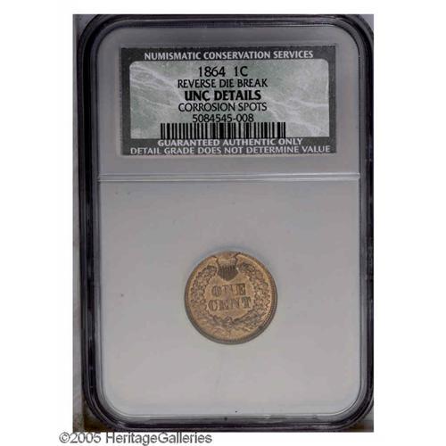 1864 1C Copper-Nickel Indian Cent--Reverse Die Break, 1864[1C] Bronze No L Indian Cent--Reverse Die