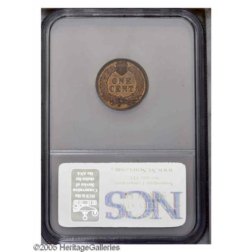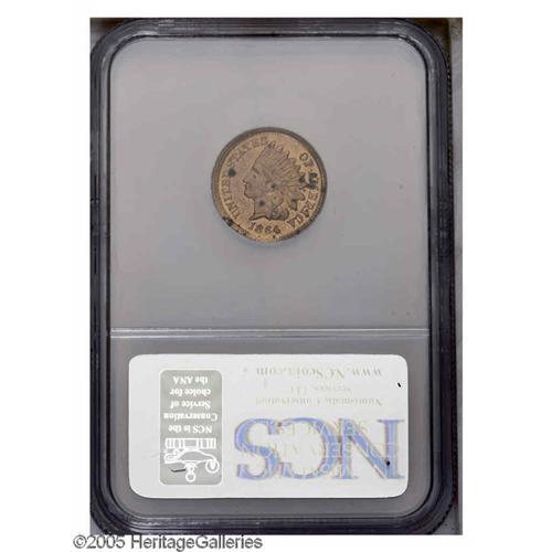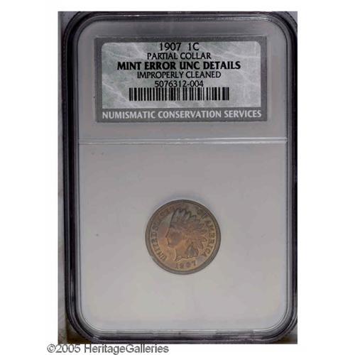 <B>1864<1C> Bronze No L Indian Cent--Reverse Die Break, Corrosion Spots--NCS, Unc. Details,</B></I> a large die break is centered at 12 o'clock on the reverse, a lustrous and bold honey-gold piece with several small dark obverse spots; and a <B>1907 Indian Cent--Partial Collar, Improperly Cleaned--NCS, Unc. Details,</B></I> suspicious rose, gold, and icy-blue colors, the base of the 1 in the date is repunched, probably Snow-15.