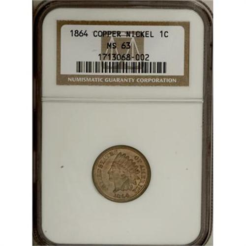 <B>1864 1C Copper-Nickel MS63 NGC.</B></I> . NGC Census: (222/450). PCGS Population (342/476). Mintage: 13,740,000. Numismedia Wsl. Price for NGC/PCGS coin in MS63: $195. (#2070)<BR><BR><B>Coin Engraver:</B> James B. Longacre<BR><BR><b>Shipping:</b> Coins & Currency (<a target="_blank" href="http://www.heritageauctions.com/common/shipping.php">view shipping information</a>)