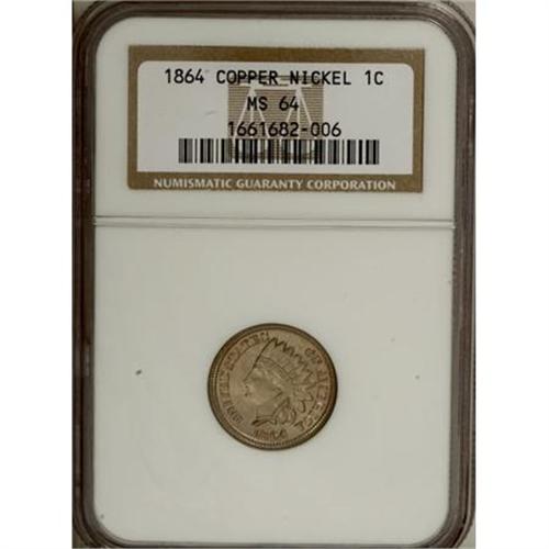 <B>1864 1C Copper-Nickel MS64 NGC.</B></I> . NGC Census: (334/116). PCGS Population (380/96). Mintage: 13,740,000. Numismedia Wsl. Price for NGC/PCGS coin in MS64: $340. (#2070)<BR><BR><B>Coin Engraver:</B> James B. Longacre<BR><BR><b>Shipping:</b> Coins & Currency (<a target="_blank" href="http://www.heritageauctions.com/common/shipping.php">view shipping information</a>)