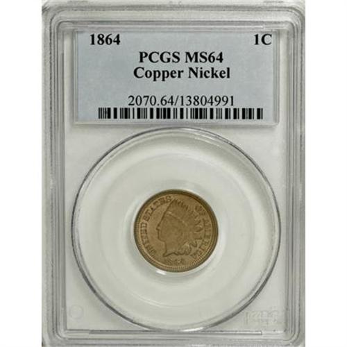 <B>1864 1C Copper-Nickel MS64 PCGS.</B></I> PCGS Population (370/95). NGC Census: (335/115). Mintage: 13,740,000. Numismedia Wsl. Price for NGC/PCGS coin in MS64: $268. (#2070)<BR><BR><B>Coin Engraver:</B> James B. Longacre<BR><BR><b>Shipping:</b> Coins & Currency (<a target="_blank" href="http://www.heritageauctions.com/common/shipping.php">view shipping information</a>)