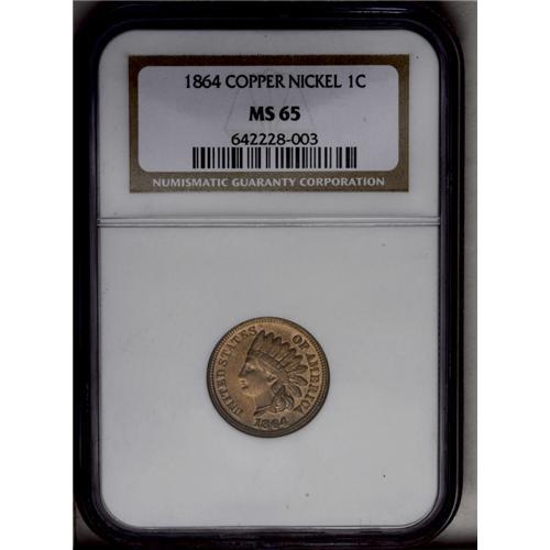 <B>1864<1C> Copper-Nickel MS65 NGC.</B></I> Although certain obverse design elements are a trifle weak, the overall visual appeal of this desirable Gem remains high. Both sides have brilliant gold and tan surfaces with satiny luster.