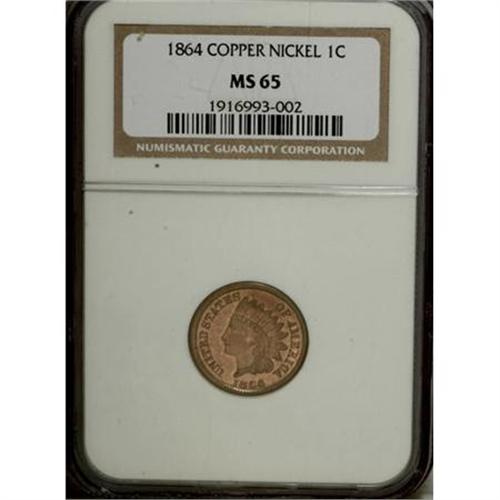 <B>1864 1C Copper-Nickel MS65 NGC.</B></I> Pale salmon shadings visit the obverse, while the reverse assumes slightly deeper copper-orange coloration. Well struck and carefully preserved, an attractive Gem example of the final copper-nickel cent issue. NGC has graded 14 finer pieces (1/08).<BR><BR><B>Coin Engraver:</B> James B. Longacre<BR><BR><b>Shipping:</b> Coins & Currency (<a target="_blank" href="http://www.heritageauctions.com/common/shipping.php">view shipping information</a>)