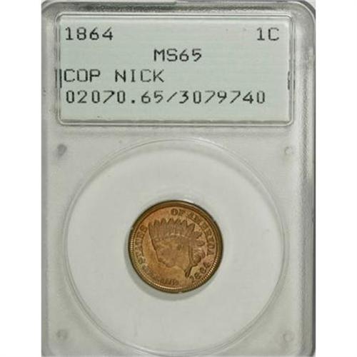 <B>1864 1C Copper-Nickel MS65 PCGS.</B></I> Approximately 25% of the Indian cents dated 1864 were struck in copper-nickel; the remainder were produced in bronze. This Gem example is well struck and lustrous, with subtly variegated coloration on both sides. The surfaces are blemish-free with minimal flyspecks. Only the upper feather tips of Liberty's headdress are softly struck. Certified in a first-generation PCGS holder. <BR><BR><B>Coin Engraver:</B> James B. Longacre<BR><BR><b>Shipping:</b> Coins & Currency (<a target="_blank" href="http://www.heritageauctions.com/common/shipping.php">view shipping information</a>)