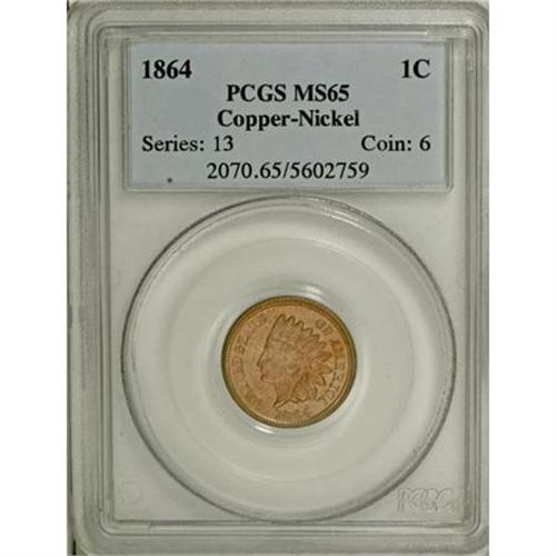 <B>1864 1C Copper-Nickel MS65 PCGS.</B></I> Virtually untoned with a good strike and no mentionable marks. Minor clockwise die rotation is noted on the reverse. Population: 86 in 65, 10 finer (12/07).<BR><BR><B>Coin Engraver:</B> James B. Longacre<BR><BR><b>Shipping:</b> Coins & Currency (<a target="_blank" href="http://www.heritageauctions.com/common/shipping.php">view shipping information</a>)