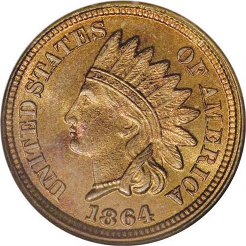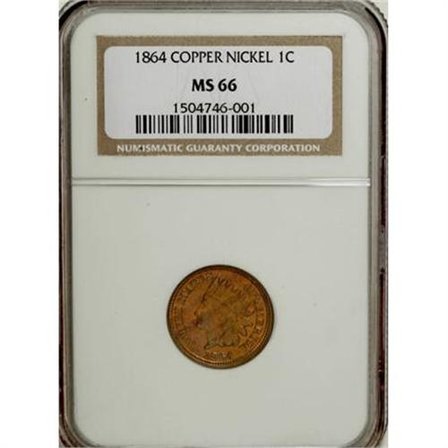 <B>1864 1C Copper-Nickel MS66 NGC.</B></I> This Premium Gem 1864 copper-nickel cent has uncharacteristically orange-red luster, that at first glance makes one think that this coin might in fact be bronze. Upon examination by several catalogers, however, we believe the piece to indeed be copper-nickel. We weighed the encapsulated coin on a gram scale, comparing its weight to an NGC-holdered Mint State bronze Indian cent, and found the former heavier than the latter. Also, the feathers in the headdress of the copper-nickel coins appear to be slightly narrower than those of the bronze cent. The strike leaves crisp definition on the devices, and both sides are nicely preserved. Census: 14 in 66, 0 finer (8/07).<BR><BR><B>Coin Engraver:</B> James B. Longacre<BR><BR><b>Shipping:</b> Coins & Currency (<a target="_blank" href="http://www.heritageauctions.com/common/shipping.php">view shipping information</a>)